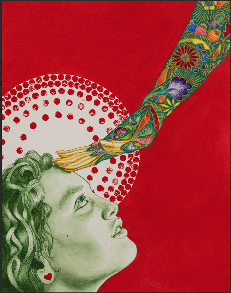 A mother's hand is reaching down and the intricacy of the colores, the floral and filigree patterns represent all of her life lessons thus far. She is to hold some to herself, pass down what is valuable and provide her daughter the freedom to make some choices of her own. The color green represents vida, the creation of life itself. This mother and daughter are bonded, connected. The child is a blank slate, her skin glows as she looks up at her mother. Awaiting her loving touch, a mother chooses to invest all she knows to be good into her daughter. This mother's touch is golden.
