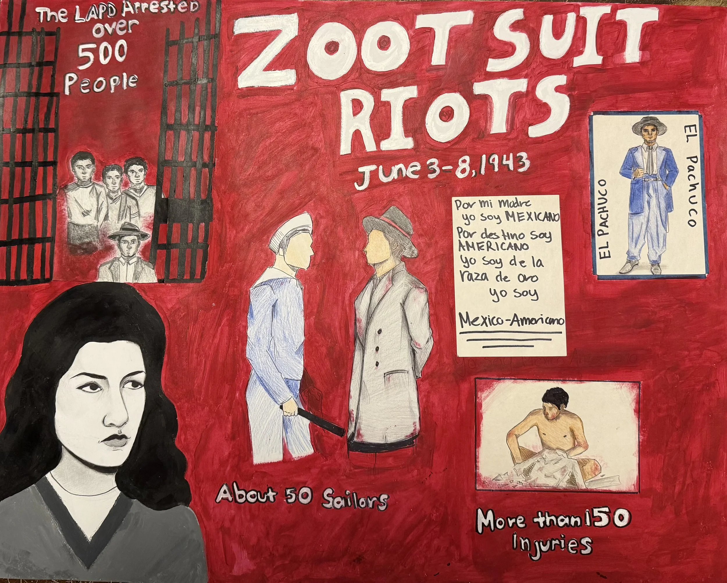 Chicanos in American history struggled with identity. In the 1940s, young Chicanos, known as Pachucos, adopted the Zoot Suit to resist assimilation. During the summer of 1943, American servicemen beat anyone appearing to be a Pachuco in Los Angeles. Many Euro-Americans considered the Pachuco style unpatriotic due to the use of rationed textiles during World War II. This created tension, as Chicanos were seen as inferior and expected to assimilate. For days, Pachucos were beaten, women assaulted, arrested, and stripped by sailors. My mural depicts the pain and discrimination Pachucos faced during the Zoot Suit Riots and emphasizes the importance of community.